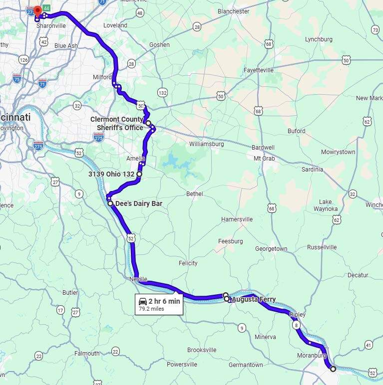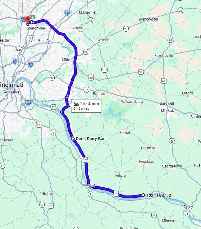 Thursday's Guided Ride (#2) Riverside - Maysville Ride to Maysville, Kentucky for lunch @ Delite's Diner Round Trip - 179 miles 4 hours 12 minutes Saddle Time Total Time is about 6 hours