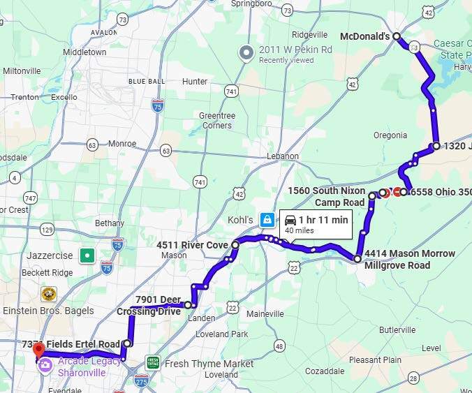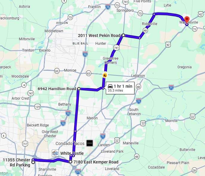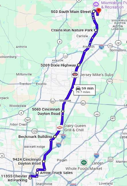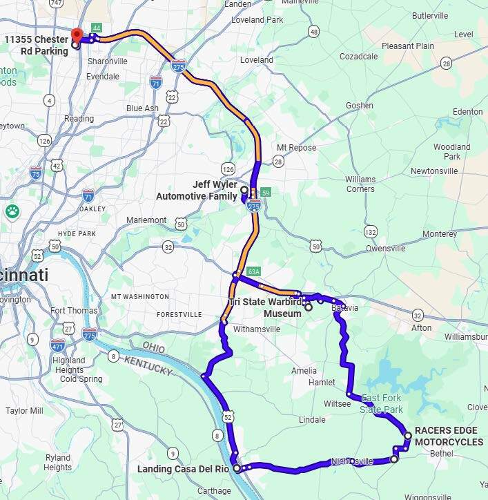 Saturday's Guided Ride (#3) Waynesville, Ohio (Lunch Stop @ McDonalds) Round Trip - 75 miles 2 hours 30 min Saddle Time Total time is about 3 1/2 hours