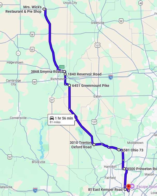 Thursday's Guided Ride (#1) Mrs. Wick's Restaurant & Pie Shop Ride to Winchester, Indiana for lunch @ Mrs. Wick's Restaurant & Pie Shop Round Trip - 162 miles 4 hours 35 minutes Saddle Time Total Time is about 6 1/2 hours